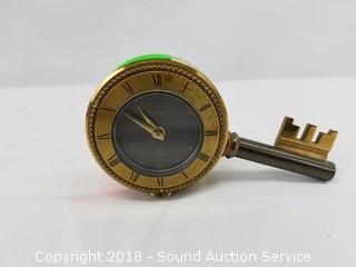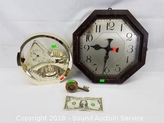 Includes: Rhythm Quartz Movement Clock (Works, 9" diameter), Unique Antique Waltham Wind Up Wall Clock (Doesn't seem to be winding, 13" octagon), and Swiza 7 Jewel Key Wind Up Alarm Clock (Swiss Made, Works, 2" x 4").