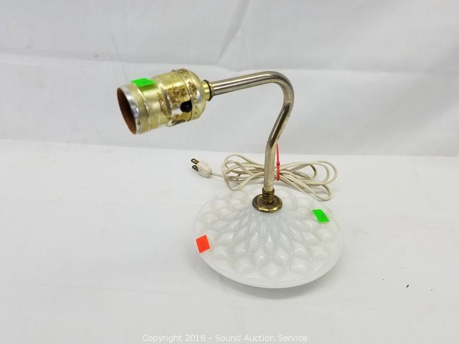 Articulating lamp is marble and brass finish. Wall sconce is milk glass, extends 8" from the wall. No shades. Approx. 16" H.