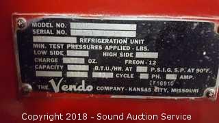 Couldn't get the front door open, cracks open but the latch is stuck. Comes with the key. On Casters. By The Vendo Company, Kansas City Missouri. Model XH818. Serial XH603 13929. Approx. 62" H, 27" W, 18" D.