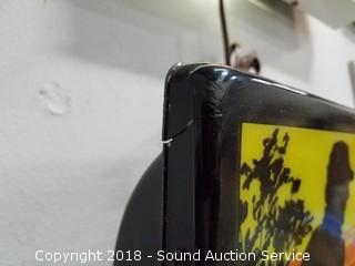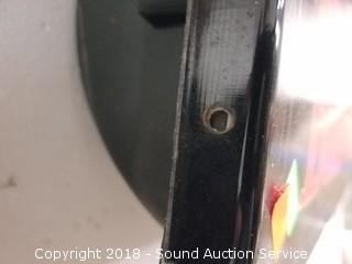 Does light up, very dim, may have a burnt bulb. Has a small crack on 2 corners, missing one of the screws for the faceplate. Approx. 18" square, 4" D.