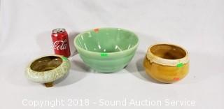 California pottery bowls are approx. 3" and 4" H. Bauer bowl is #12, has a crack in the bottom.