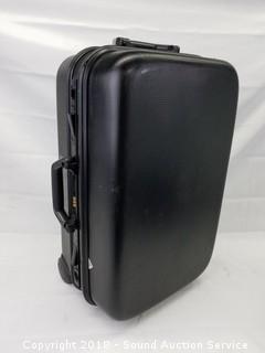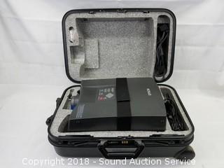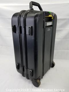 Comes with carrying case (telescopic handle, wheels, styrofoam insulation), transfer cables, and power cable.