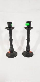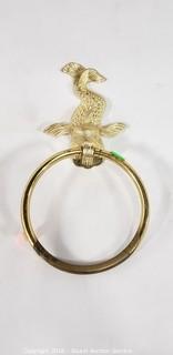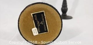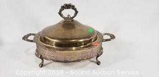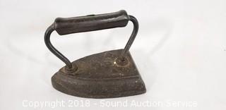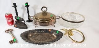 Includes: Cast Iron Candlestick Holders, Cast Iron Sad Iron, Brass Towel Ring, Silverplate Chafing Dish and Platter, Silver Overlay Bowl, and Large Skeleton Key.
