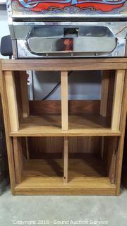 Comes with stand, approx. 27" H, 22" W, 16" D. Machine works, comes with key (lock is stuck in the open position). Approx. 42" H, 19" W, 20" D.