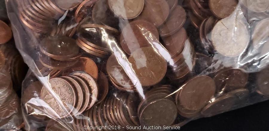 One of the pennies bags is Canadian one is American. TW: US Pennies = 7lbs, Canadian Pennies = 4.12lbs, US Nickels = 1lbs & US Dimes = 8.8oz. ATTN: We are not coin experts or graders please use your own judgement when bidding.
