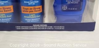 Includes: (2) 7.5oz continuous spray cans, and (1) 7oz sunscreen lotion.