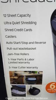 12 sheet capacity, ultra quiet, shreds credit cards, pull out waste bin, casters, jam free rollers.