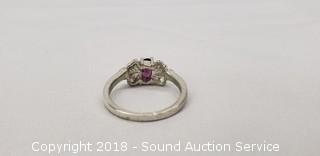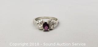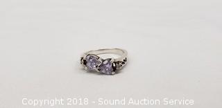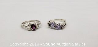 Sizes 5 and 6. One has a purple tint clear heart shaped stone (4.5mm x 4.5mm). Other has an oval garnet? setting (3.5mm x 4.5mm). Total weight: 4.4 grams.