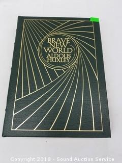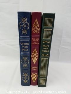 All are leather bound with gold gilded edges, in near unread condition. Includes: The Red Badge of Courage by Stephen Crane, Brave New World by Aldous Hucksley 1978, and Grim's Fairytales 1980.