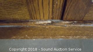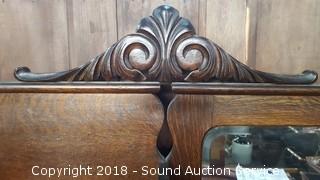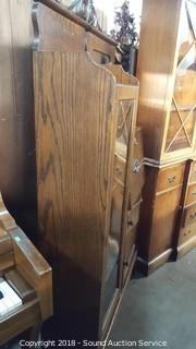 Mirror is hand beveled. Made of oak. Approx. 67" H, 36" W, 11" D. Skeleton key locks. *SKELETON KEY LATER IN AUCTION FITS THIS".