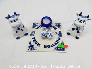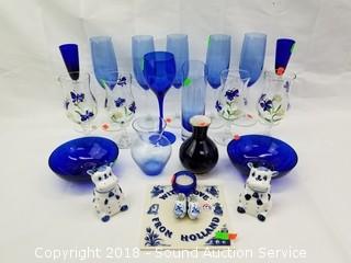 Includes: Hand Painted Holland Delft Pieces, Cow S/P Shaker, and Various Stemware.