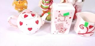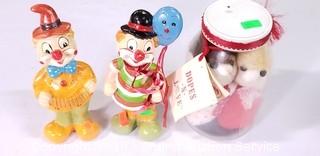 Includes: Fire King Creamer, Fire King Teapot, 2 Dopeson Love Dolls in a Jar, Bingo Bucks Ceramic Coin Bank, and 2 Clown Figures.