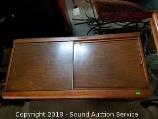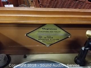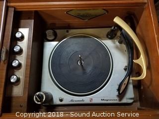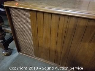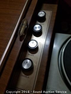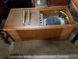 Works! Plays 16's, 33's, 45's, and 78's. Looks like it is missing 2 of the legs. Approx. 15" H, 36-1/2" W, 17" D.