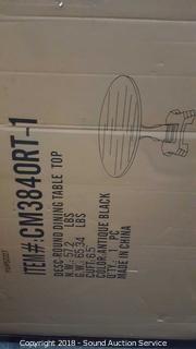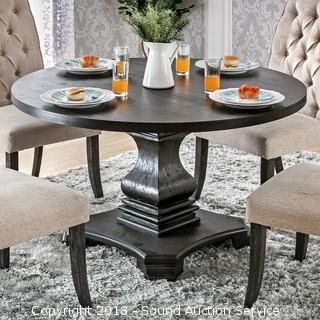 48" diameter. Furniture of America Lucena Antique Black Wood Traditional Farmhouse Style Pedestal Base Round Dining Table. Has some nicks on the bottom and one on the top. You are only getting the top, pedestal base not included.