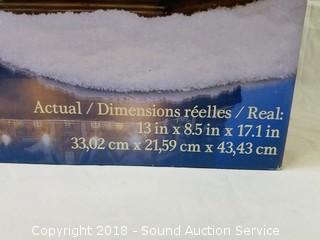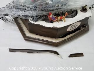 A piece on the bottom is broken, still works. Comes in original box. Approx. 17" H.