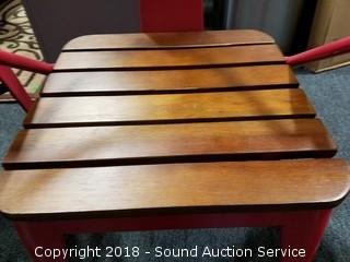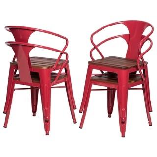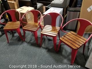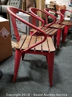 Comes in original box, has been used, slightly discolored metal from sitting out, some scuffs, one seat has a chip in the wood. Dimensions: 31 inches high x 20 inches wide x 19 inches deep. Stackable, Water Resistant. Scratch and mar resistant powder coat finish.