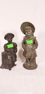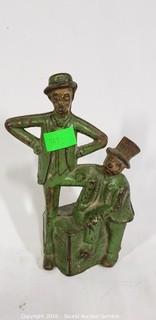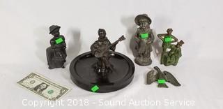 Includes: Antique Mutt & Jeff Figure, 2 Girls, Eagle, and Clown Playing Guitar Steel Ashtray. Approx. 3.5" to 7" H.