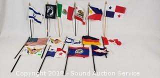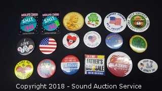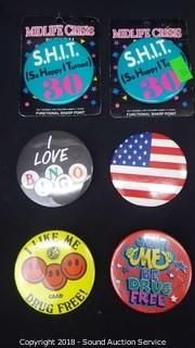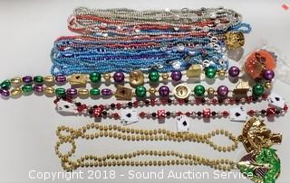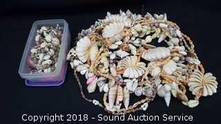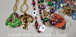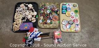 18 Collectible Buttons, Casino & Beer Theme Plastic Fashion Jewelry, Collection of Seashell Beaded Fashion Jewelry, NIP Fuel Filter - Liber Finer FF4502 G4760, and 15 Various Small Flags.