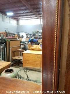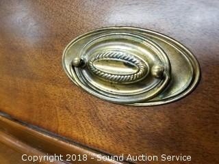 Has glass top protector, brass hardware, drawers are dovetail construction, mahogany finish. Dresser is approx. 34" H, 58" W, 20" D. Mirror is approx. 44" x 31", hangs on the wall, set to hang vertically, can be hung vertically and horizontally.