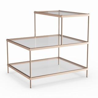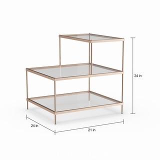 Comes in original box, missing a piece of the glass, otherwise like new, assembly required. Made of plated iron and tempered glass; Metallic brass/ gold finish. Measures 23.75 inches high x 20.5 inches wide x 24 inches deep. 35lbs capacity per shelf.