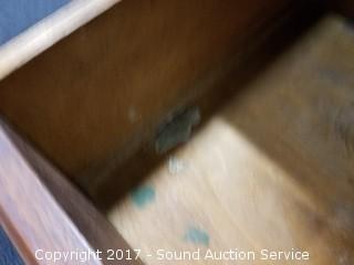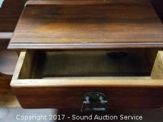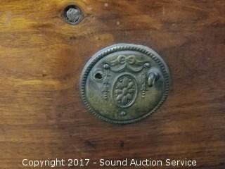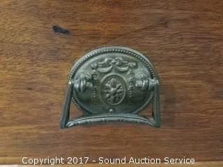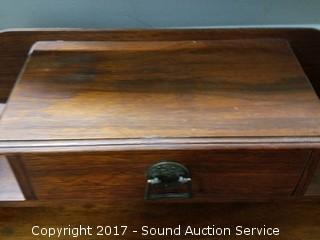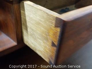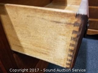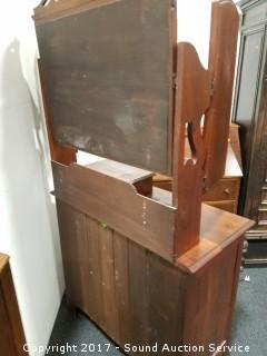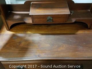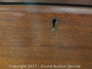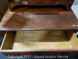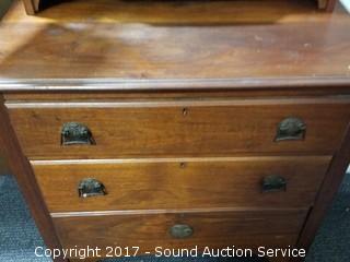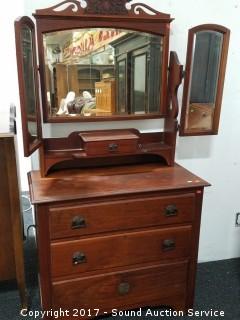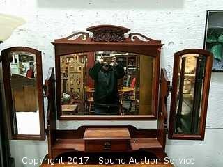 This thing is incredible, absolutely gorgeous with a center swivel mirror & 2 side mirrors vanity topper, 4 drawers with dovetail construction, skeleton key locks (no key), cast iron drawer pulls (one of the pulls is missing the handle).