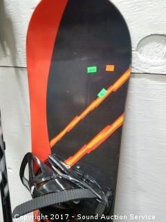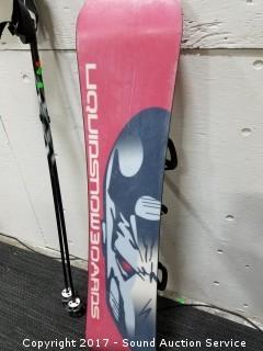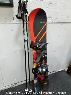 With Burton Bindings & Swix Ski Poles. Marked 124. Overall 48" long, 10" wide.