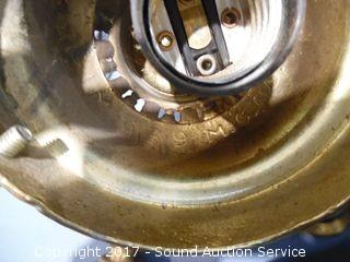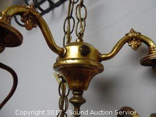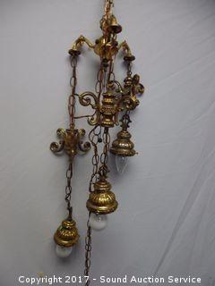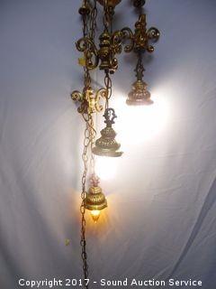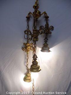 The have been tested and all the fixtures work. There is a three way pull switch so one, two or all three can be on at once. It does not include any of the shades. The lamp measures 29" long and about 14" wide. The chain is about 13 feet long. There are a few spots of tarnish but no damage to the light. The lamp looks to be made of a metal with a brass finish. Inside the bulb housing it says GIM 639 M.C. Co