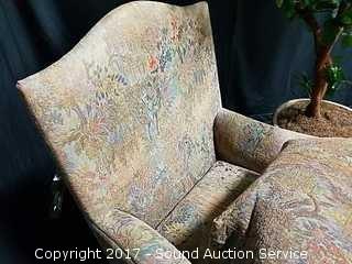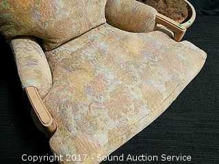 Has down cushions. Approx. 40" by 33" by 35" with a 20" high 30" wide seat.