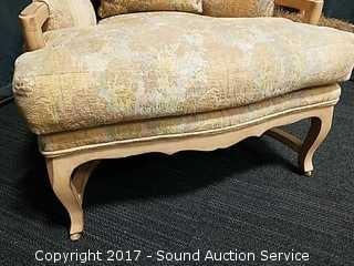 Has down cushions. Approx. 40" by 33" by 35" with a 20" high 30" wide seat.