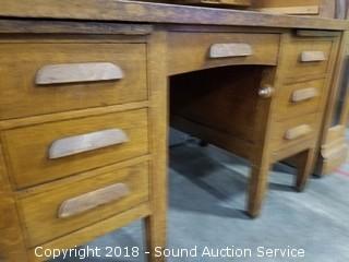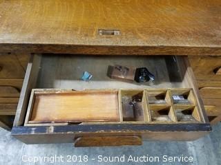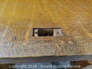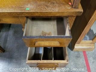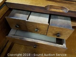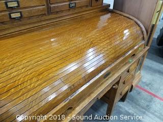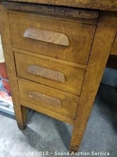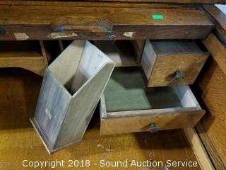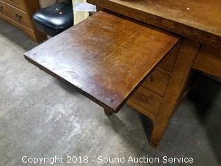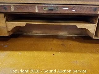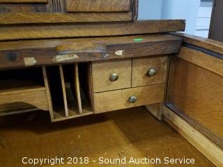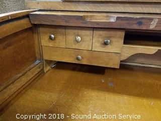 Skeleton key lock, no key. Locking mechanism is present but is not attached to the desk. Drawers are dovetail construction. Has pull out tray, cubbies. Some scratching and wear to the finish. Approx. 44" H, 54" W, 32" D.