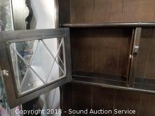 Made in England in 1975. Has 4 dovetail construction drawers, 2 lower cabinets, 2 leaded glass door upper cabinets, all 3 shelves have plate grooves, pewter hardware and drawer/door pulls. Comes in 2 pieces. Some wear to the finish, in overall good condition. Overall approx. 67-1/2" H, 64-1/2" W, 19" D.