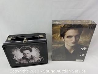 Includes: Edward lunch pale, door hangers, magazines, 3 paper back novels, 3 movies, diary, and sealed jigsaw puzzle.