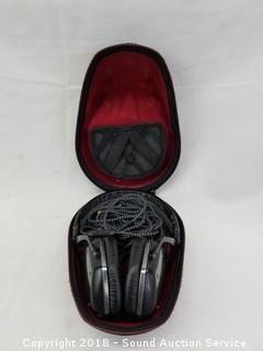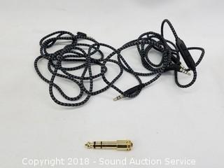 Comes with headphone cables. Has a 3.5mm headphone jack and 6.5mm stereo adapter. Comes with nice hard leather case.