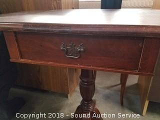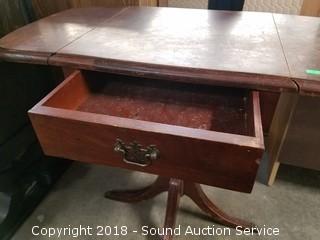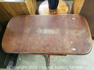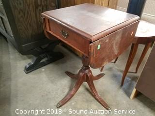 Single drawer, brass claw feet. Some scratching and wear to the finish. With sides up approx. 26" H, 30" W, 15-1/2" D. Only 15-1/2" wide with sides down.