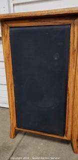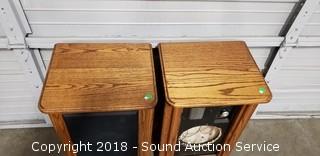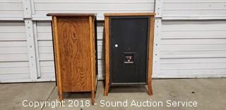 One doesn't have a cover. Boxes double as a side table, oak finish. No speakers. Fits an 8" woofer. Cabinet is overall approx. 27" H, 15" W, 13" D.