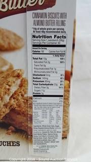 Contains 30 pouches. Cinnamon biscuits with almond butter filling. Best by April 19, 2019.