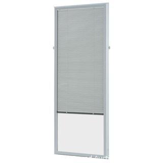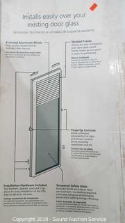 22" x 64".Fits door glassed raised frame sizes, width 23-3/4" to 24", height 65-3/4" to 66". Enclosed aluminum blinds, molded white finish frame, installs easily over existing door glass. Like new in original box.