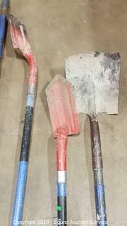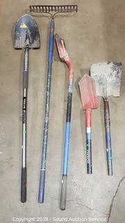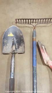 Includes: Rake, 5" and 9" Spade Shovels. Handles have been cut down on two of the shovels. Hand is falling off of the rake.