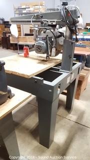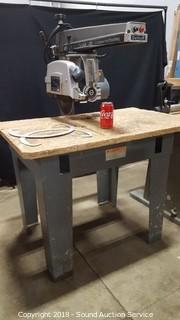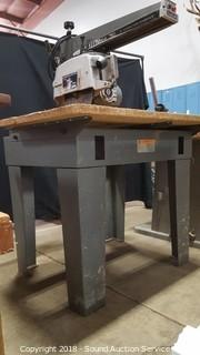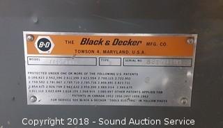 In good working condition. DeWalt Slide Miter Saw with a Black & Decker Steel Table Particle board top. Overall approx. 55" T x 38-1/2"W x 32" D.