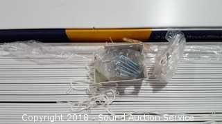 Comes with valance, blind wand and hardware. Two slats have been removed but are with the packet making it 60" long. Comes in original box.