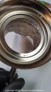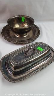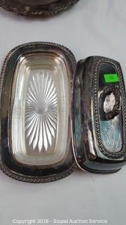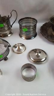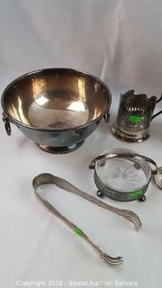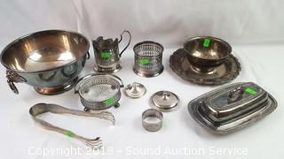 Includes: Butter dish (English Silver Mfg. Corp), Manning Bowman & Co Tongs, Napkin Ring, Small Glass Inlaid Candy Dish, EPNS Cozy, Lion Head Bowl, lids, Oneida silverplate sugar bowl, and silverplate cup cozy.