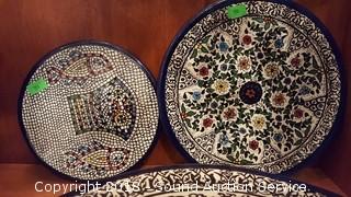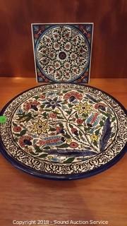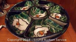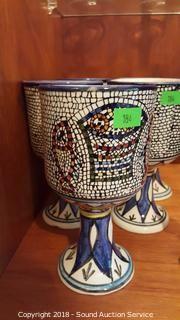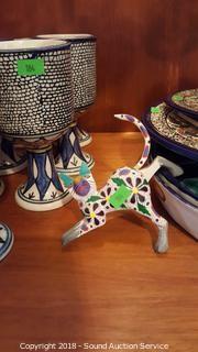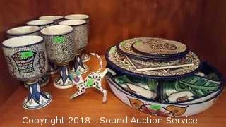 Includes: 7 hand painted goblets (look to be Italian, base has been repaired on one), 4 trivets/chargers (6" to 11"), sectional appetizer dish, and painted cat figure.