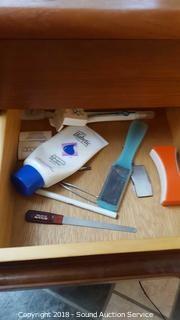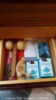 On wheels. Comes with contents. Includes: personal hygiene products, massagers and playing cards. Has a black stain on the top. Approx. 20" H, 13" W, 12" D.