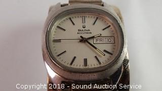 Has a native mark for Marcus Cochwikvia of the Hopi Tribe. Bulova Accutron wristwatch, believe it needs a new battery. The cuff is 1-1/2" wide, 8" diameter, solid sterling.