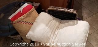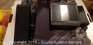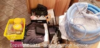 Includes: pillow, woven bag, carpet cleaner hose, cotton hand towels, light bulbs, Panasonic wireless speaker system, garbage bags and more.