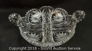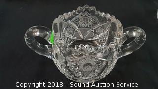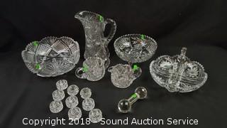 Includes: salt cellars, cream, sugar, pitcher, footed dish, fruit bowl, prism barbell and sectioned dish.