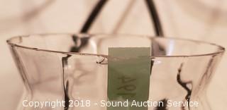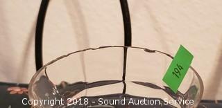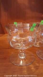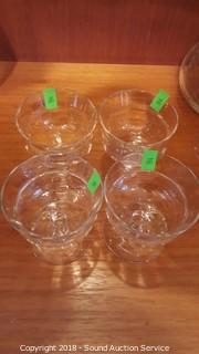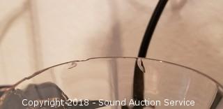 Glasses are 3-1/4" H, have quite a few chips. Decanter is in excellent condition. Acid Etched on the with Makers mark.