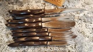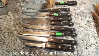 Includes: 8 Cutco Knives ((4) 1759KM Steak & Butter Knives, 1721KM Knife, 176KM Spreader, 1720KL Paring Knife, and 1729KM Knife), and 7 J.A. Henckels Zwilling Steak Knives, Paring Knife, and Chef's Knife.