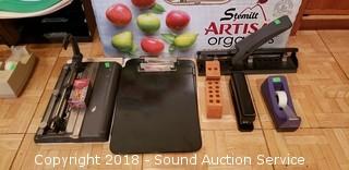 Electric pencil sharpeners, pens, pencils, paperclips, scissors, notepads, thumb tacks, 2 hole punch, 3 hole punches, staplers, tape dispensers, desktop organizers, and more.