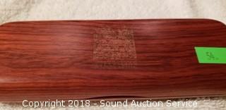 Wallet is a Duluth, well made. Nice leather hand made pouch. Pen set is an Australian wood set with case. Keychain is a nautical ships wheel, brass, with matching wooden box.